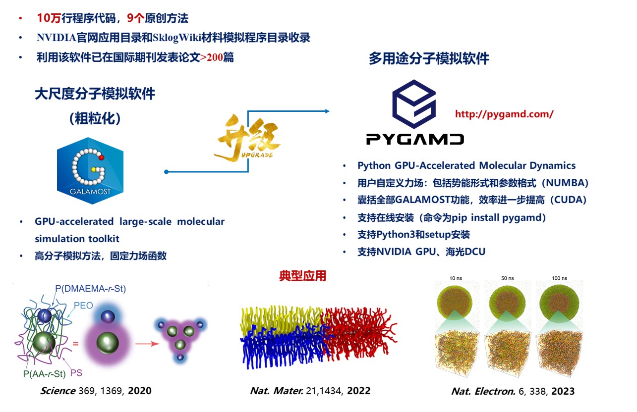 聚合物分子模拟软件平台PYGAMD是“十四五”国家重点研发计划“关键聚合物结构材料集成计算设计方法与应用”项目(2022YFB3707300)支持的重要成果,集成了具有自主知识产权的聚合物分子构型生成工具、分子动力学模拟器、数据分析程序和分子动力学解释器等子软件,可以部署运行在国产异构计算平台,实现从软件到硬件的完全独立自主发展。作为国际上计算效率最高的分子动力学模拟软件之一,该软件平台具有九个自主开发的分子模拟方法,其模拟结果已在Science等刊物上发表文章超过两百篇。