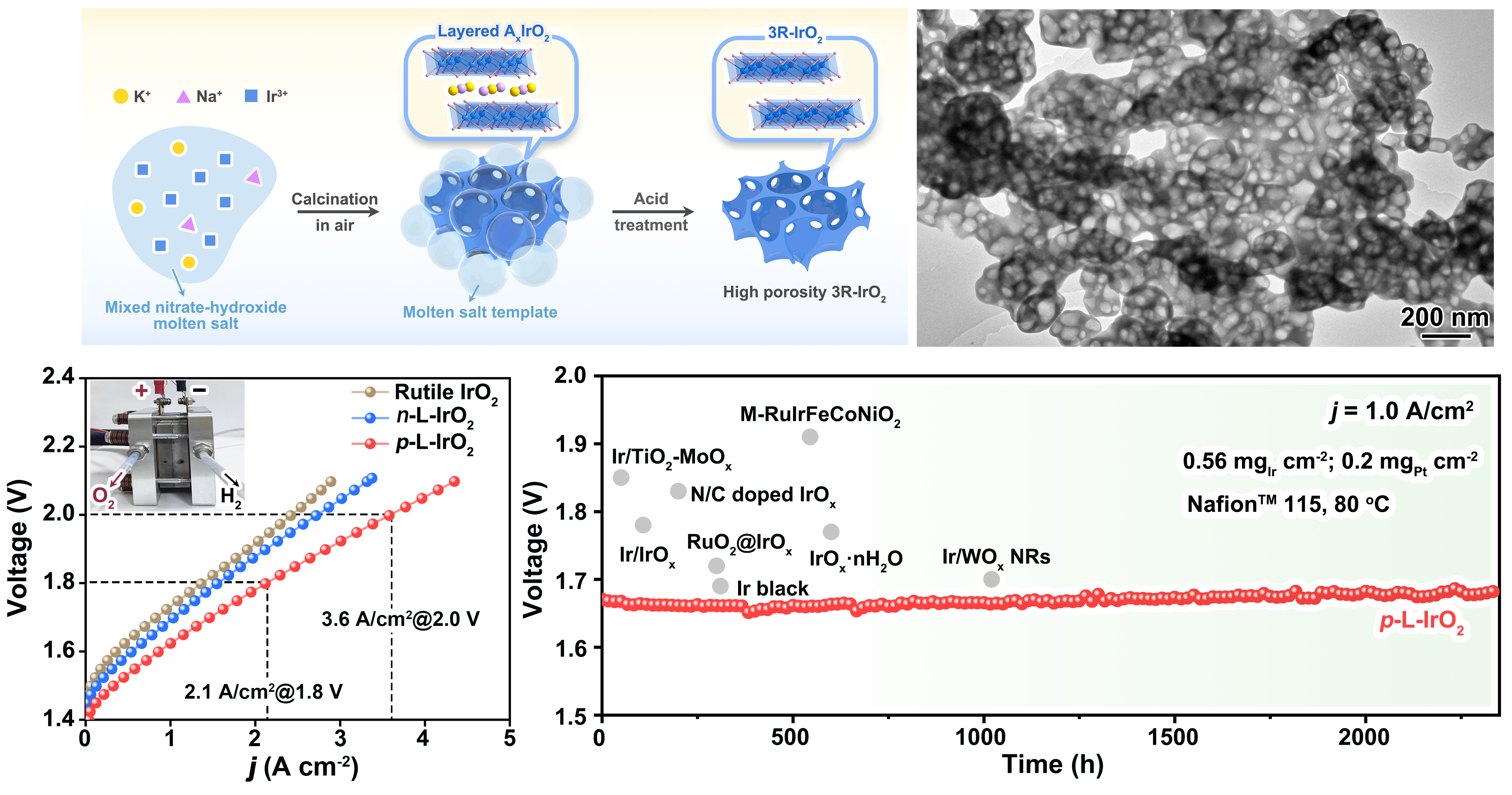 该工作提出了高度多孔化层状氧化铱的低温制备方法,并证实了多孔化层状氧化铱在构筑高性能低铱载量膜电极的结构优势,将推动新一代阳极催化剂在工业PEM电解槽中的实际应用。