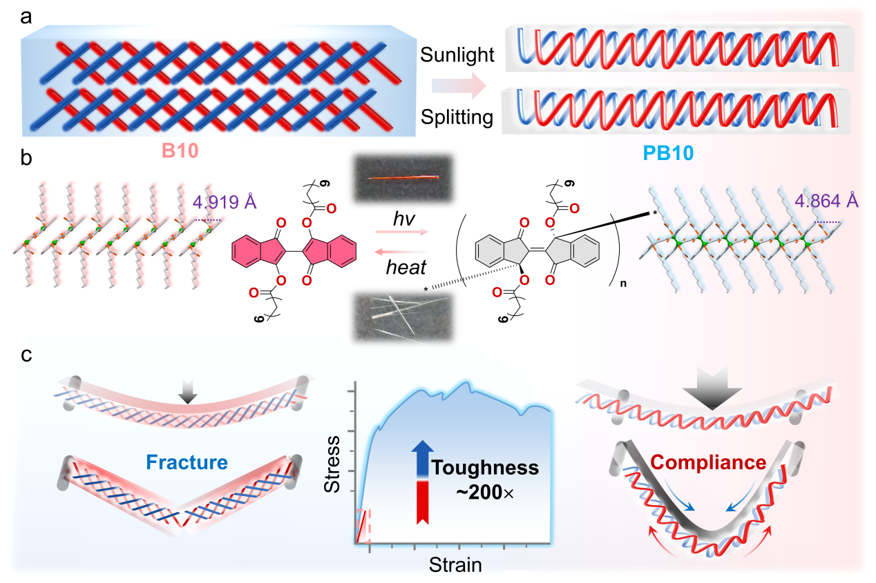 张红雨教授团队开创性地发展了可见光驱动的单晶到单晶光聚合策略,在分子水平上实现了晶体结构的精准重构,成功打破了有机晶体材料力学性能的固有局限。