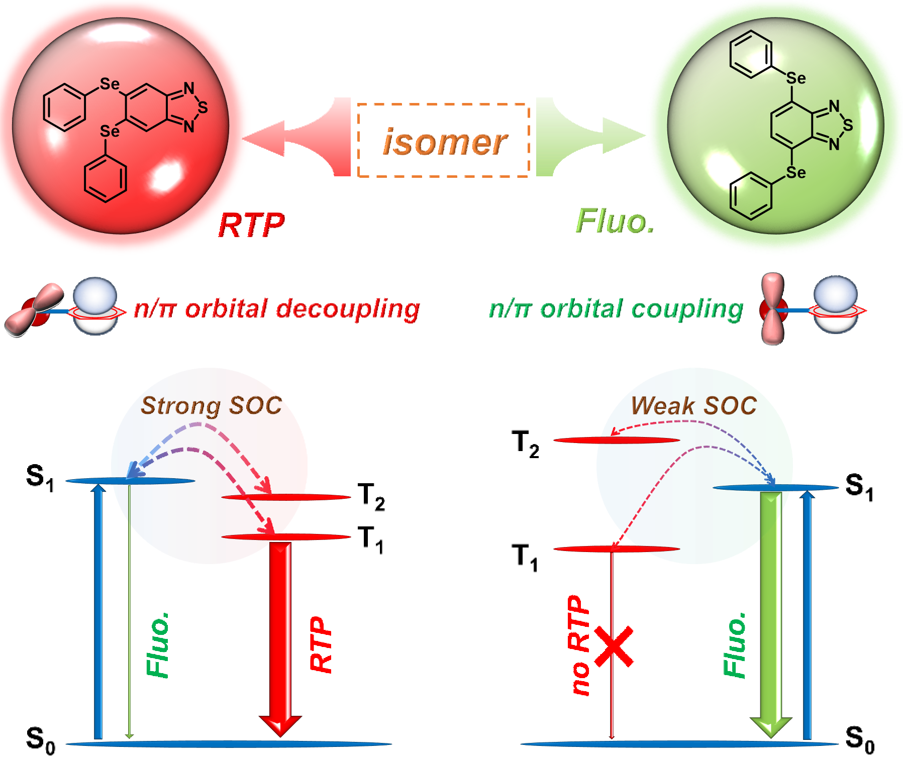 该研究成果以“n/π Orbital Decoupling via Heavy Selenium Atoms toward Efficient Red Room-Temperature Phosphorescence in Purely Organic Systems”为题发表在Journal of the American Chemical Society上(DOI: 10.1021/jacs.5c16207)。成人网站
