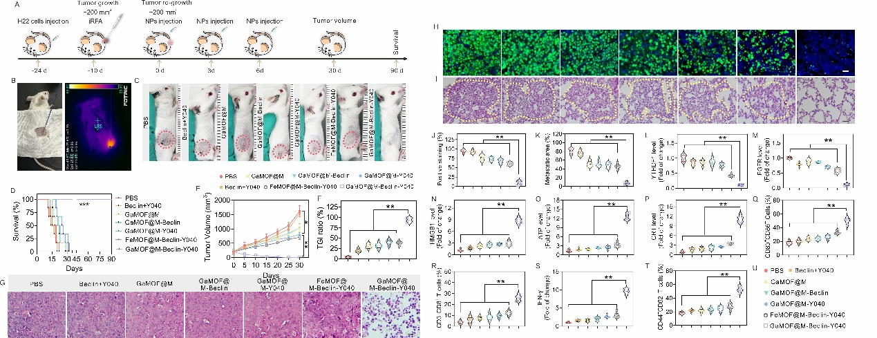 图4. GaMOF@M-Beclin-Y040有效抑制iRFA后HCC的复发。