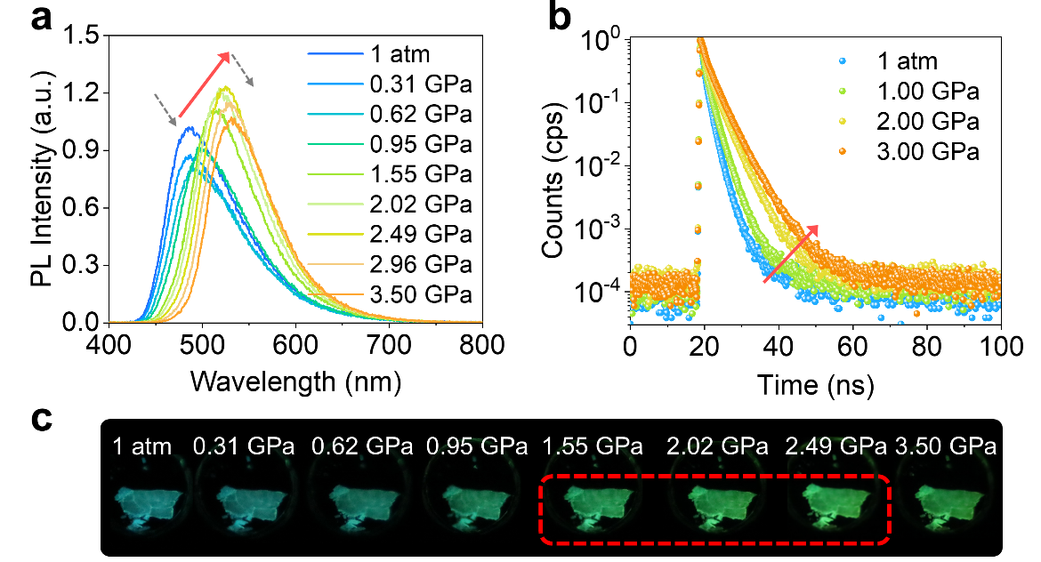 有机共轭体系在外部压力刺激下的光学响应行为是光电功能材料领域的研究重点之一。然而,在高压环境下实现高效发光面临严峻挑战:随着晶格被压缩,分子间距离显著缩短,增强的π–π作用极易诱导非辐射“暗态”激基缔合物(excimer)的形成,导致普遍观察到的荧光猝灭现象。尽管聚集诱导发光(aggregation-induced emission,AIE)策略使材料在常压下表现优异,但在高压下的紧密堆积中,如何有效规避暗态激基缔合物“陷阱”,并同时激活AIE效应,实现压致发光增强(pressure-induced emission enhancement, PIEE),仍是该领域亟待解决的科学问题。