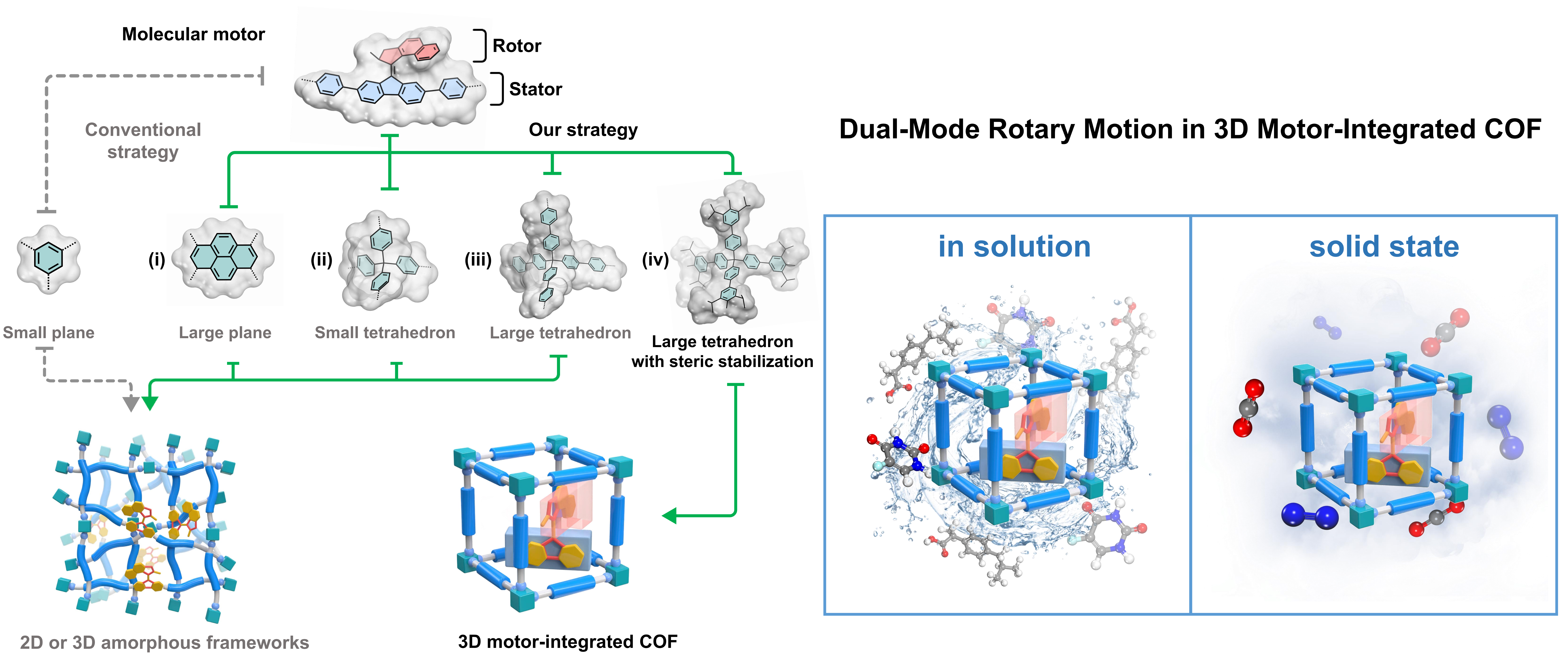 在将分子机器真正“做进材料”的过程中,一个核心难题始终存在:如何在无溶剂的固态环境中,让分子依然能够有序、可控地运动,并将这种微观运动转化为可观测的材料功能。在溶液中,分子马达可以借助周围分子提供的自由空间完成构型变化;而在晶体中,分子紧密堆积、空间受限,往往难以实现持续旋转。因此,如何在保持晶体高度有序和稳定的同时,为分子马达创造足够的活动空间,并实现从“分子转动”到“材料响应”的跨尺度转化,成为分子机器材料化必须突破的关键问题。