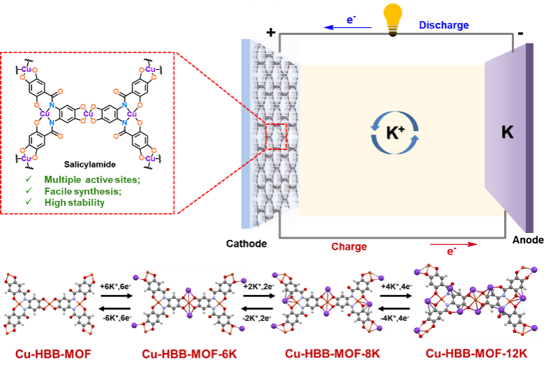 2025年5月16日,团队在J. Am. Chem. Soc.发表题为“In Situ Construction of Amide-Functionalized 2D Conjugated Metal–Organic Frameworks with Multiple Active Sites for High-Performance Potassium-Ion Batteries”的研究论文。该工作通过原位金属配位诱导平面化策略,成功制备了层状二维Cu-HBB-MOF。得益于其丰富的氧化还原活性位点与大比表面积,该材料作为钾离子电池正极表现出卓越性能,在0.2 A g-1电流密度下获得228.1 mAh g-1的初始容量,在5.0 A g-1下循环2500次后仍保持103.6 mAh g-1,每循环容量衰减率仅0.011%。结合光谱技术与DFT计算,团队揭示了动态氧化还原机制与构效关系。该研究为设计具有多活性位点的2D c-MOFs提供了有益参考。东北师范大学王恒国教授和成人网站