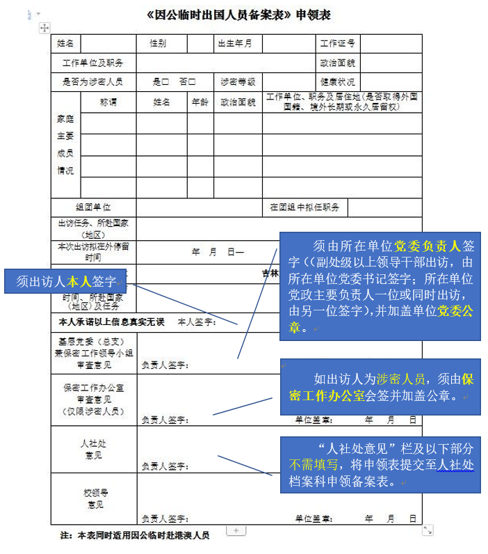 因公临时出国(赴港澳)任务须提交备案表,请到人社处申领。申领备案表须先填写《<因公临时出国人员备案表>申领表》(简称“申领表”)。申领表相关签字盖章要求如下图: